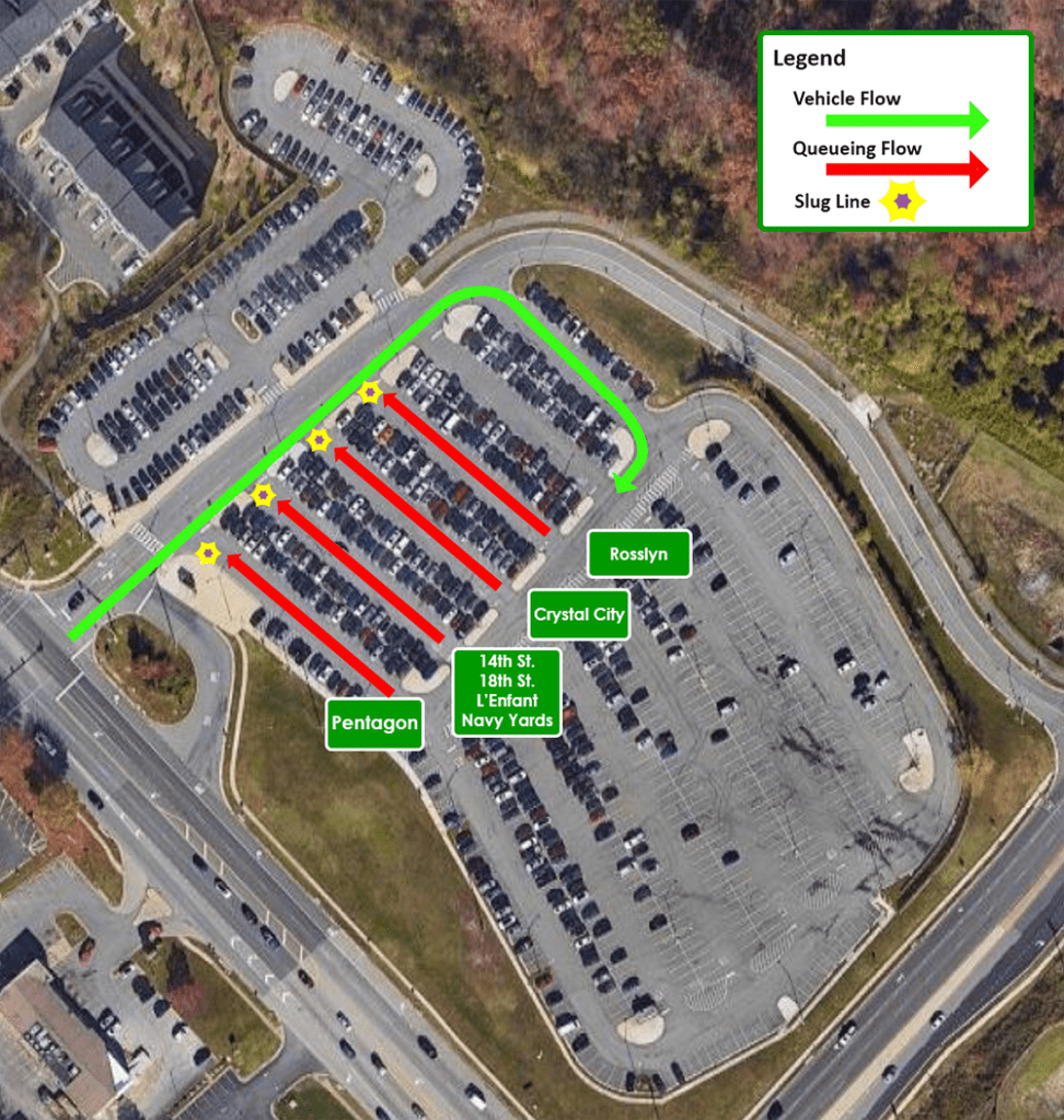 Drivers follow a designated traffic flow (as shown on the map) and call out their destination. For example, a driver heading to 14th Street or 18th Street will specify the furthest point they are going (e.g., 14th and L) so riders with all drop-off points up to L Street can join. For the Pentagon, simply stating “Pentagon” is sufficient.