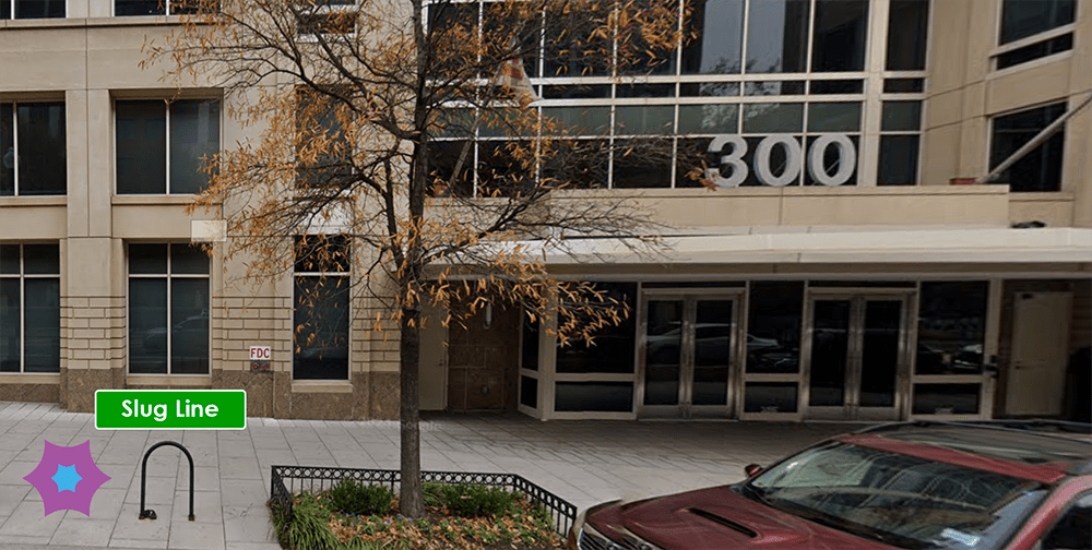 The slug is located in front of the office building at 300 M Street SE. Look for the tree that marks the designated slug line spot. If you are viewing from the street, the tree will be on your left. If you are exiting the building, it will be on your right as shown on the picture.